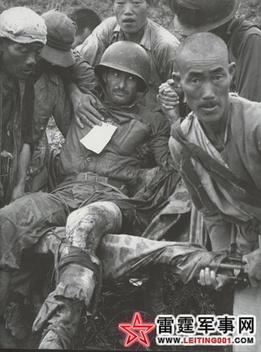 一个美国海军陆战队士兵正在被一群韩国志愿者救起,他们用的担架是用从人民军那里缴获的步枪做成的。就是这样一个受重伤的士兵,用他的微弱的声音恳请他的队长:“请让大家不要后退,无论他们用什么攻击你。”