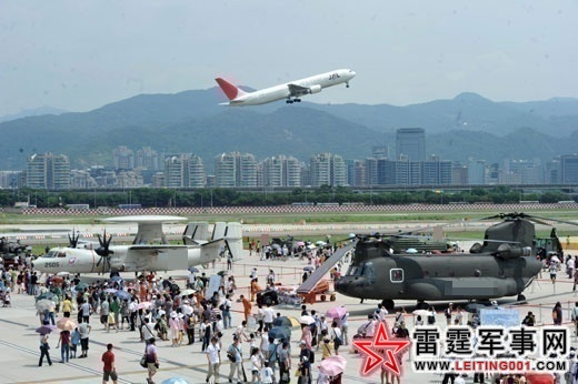 台湾《联合报》报道,台空军松山基地13日举行营区开放,尽管上午酷热、下午大雨,但一整天累计仍挤进6万多民众。S-70C救护直升机在超低空大秀特技,以及陆军神龙小组的花式跳伞表演,都赢得民众高声喝采。